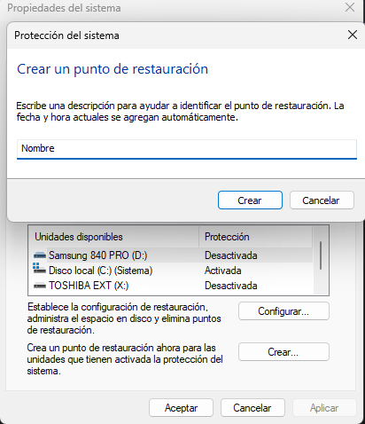 - Finalmente pone un nombre descriptivo al punto de restauracion y has clic en crear.